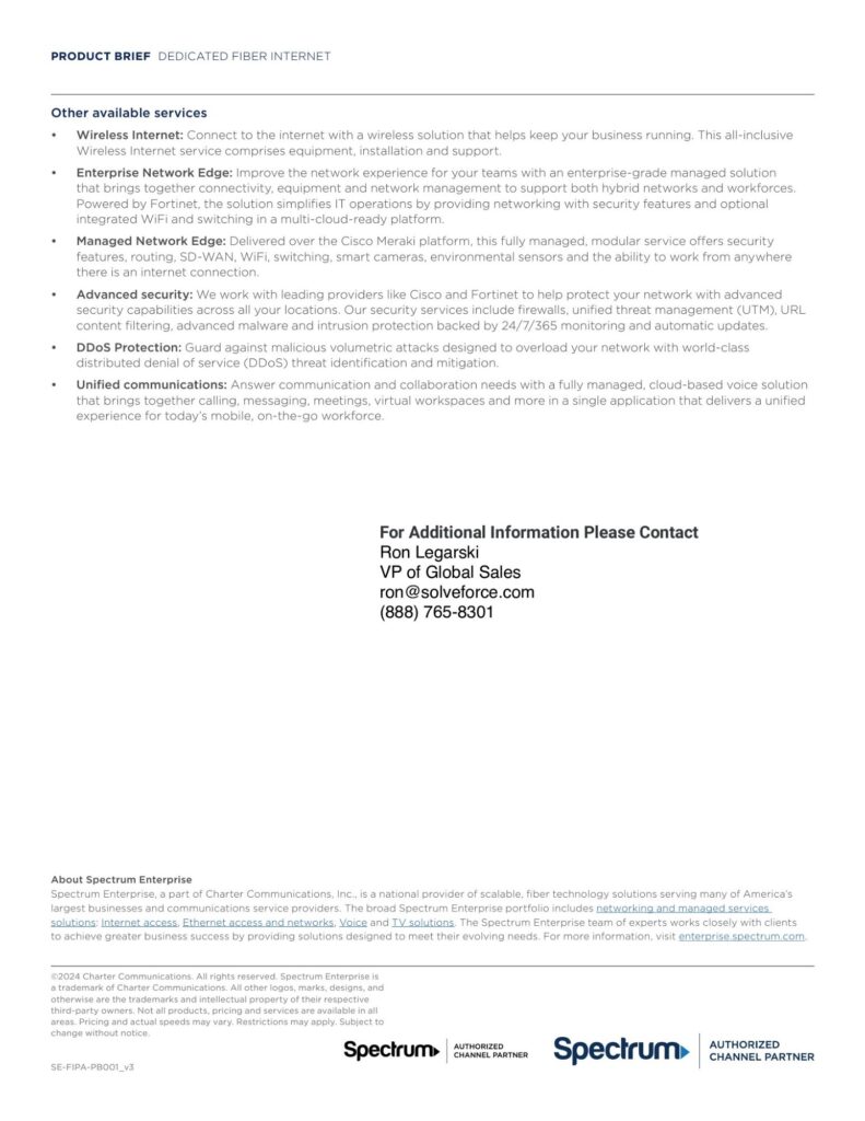 In an era where digital transformation dictates business success, reliable and high-speed internet is a cornerstone for any enterprise. SolveForce, partnered with Spectrum Enterprise, offers a cutting-edge Dedicated Fiber Internet service that not only ensures optimal performance and reliability but also scales seamlessly with your business needs, providing up to 100 Gbps of speed.