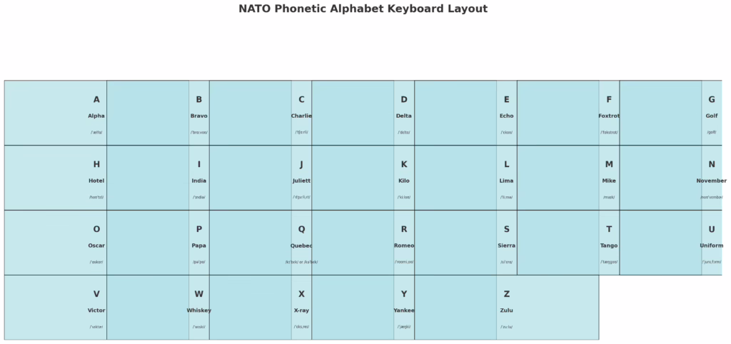 Here’s the NATO Phonetic Alphabet Keyboard Layout — each cell shows the letter, its code word, and the IPA pronunciation so it can be spoken with precision.